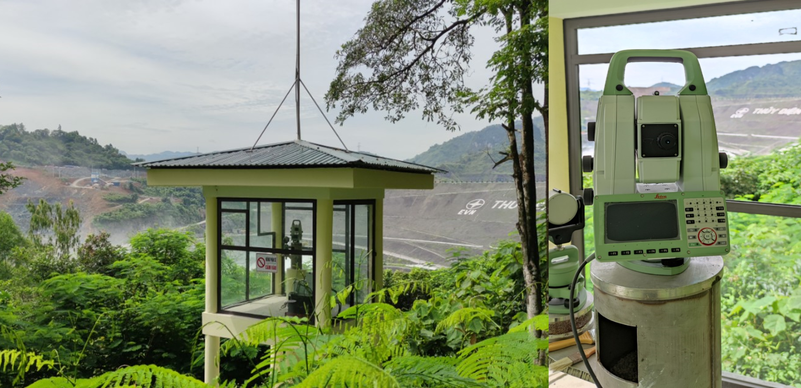 Trạm máy toàn đạc điện tử quan trắc: Sử dụng dòng máy TM60 lắp đặt tại các vị trí kiên cố, đảm bảo tầm nhìn bao quát toàn tuyến đập phục vụ công tác quan trắc tự động