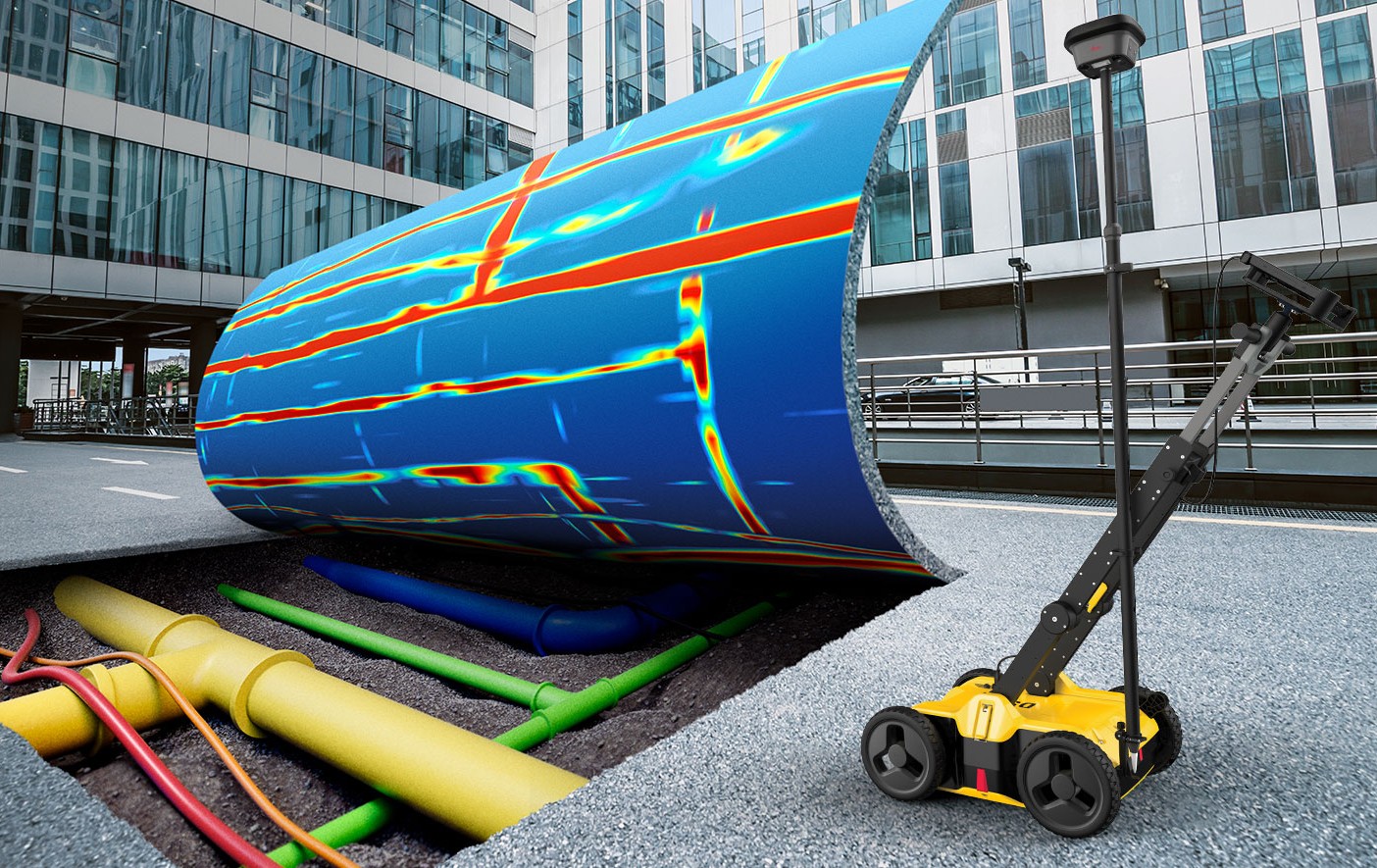 Việc xác định hạ tầng ngầm trước khi thi công là cực kỳ quan trọng để tránh rủi ro, thiết bị này phát tia sóng radar xuyên đất để thu thập, hiển thị dữ liệu dưới mặt đất cho người dùng.